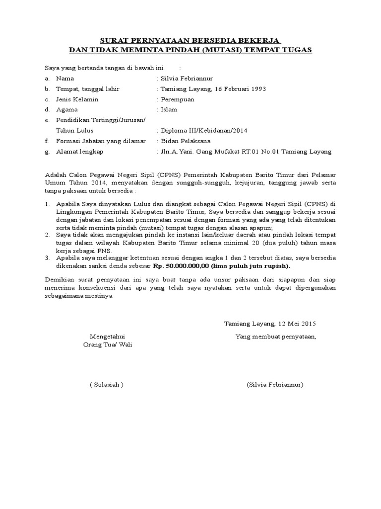 Surat Pernyataan Bersedia Ditempatkan from imgv2-2-f.scribdassets.com Yang menyatakan, ( eka haryati ) Surat pernyataan belum menikah dan sanggup tidak menikah selama mengabdi saya yang bertanda tangan di bawah ini: Download contoh surat keterangan belum menikah dari desa. Menyatakan bahwa benar belum pernah menikah dan sanggup tidak menikah selama mengikuti pendidikan di politeknik siber dan sandi negara. Dokumen ini dapat anda buat sendiri dan bisa dikeluarkan oleh kelurahan di tempat anda tinggal. Menyatakan bahwa benar belum pernah menikah dan sanggup tidak menikah selama mengikuti pendidikan di sekolah tinggi sandi negara. Tirto id kemenkumham membuka lowongan cpns 2019 sebanyak 4 598 formasi yang lebih dari separuhnya untuk lulusan sma. Contoh surat pernyataan tidak akan menikah selama 1 tahun untuk melamar kerja_ setiap instansi atau lembaga mempunyai syarat tertentu dalam merekrut karyawan baru salah satunya meminta kepada calon karyawan atau yang hendak mendaftar untuk menjadi karyawan untuk melampirkan surat pernyatan tidak akan menikah selama satu tahun jika diterima bekerja di instansi atau lembaga tersebut.